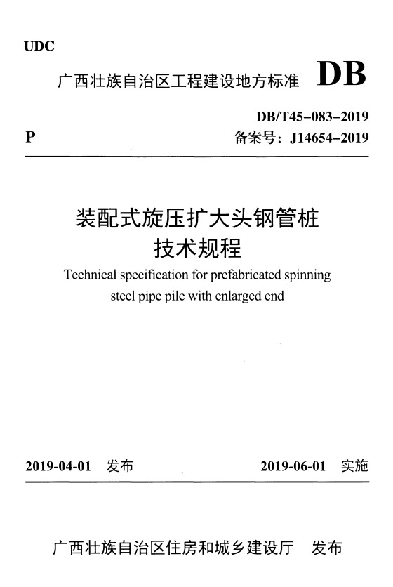 标准介绍:DBJ/T 45-083-2019 装配式旋压扩大头钢管桩技术规程