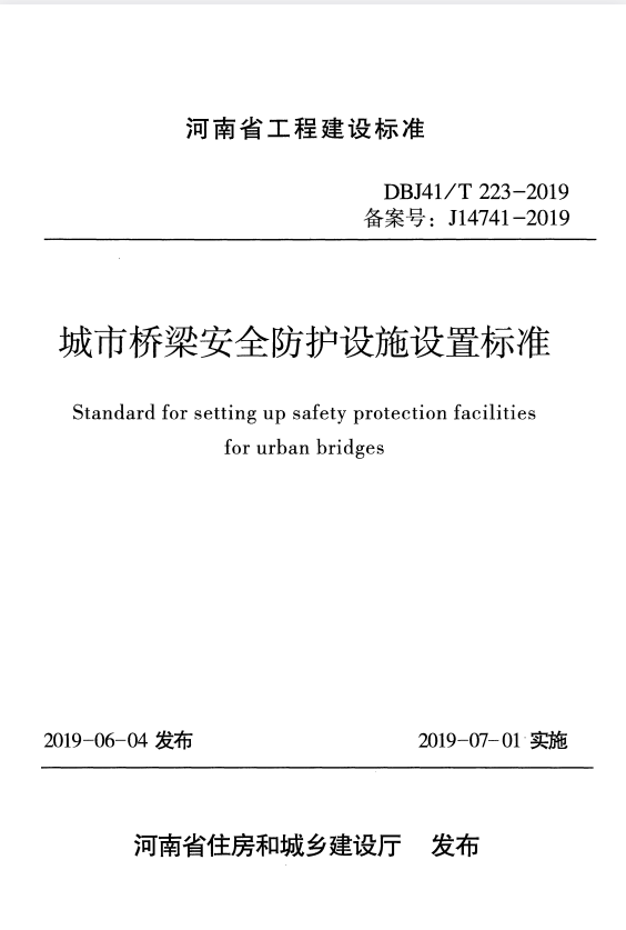 标准介绍:DBJ41/T 223-2019 城市桥梁安全防护设施设置标准Gby免费标准库