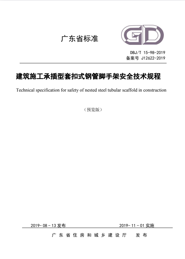 标准介绍:DBJ/T 15-98-2019 建筑施工承插型套扣式钢管脚手架安全技术规程kNm免费标准库