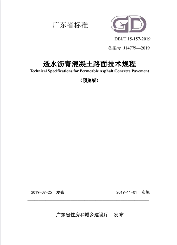 标准介绍:DBJ/T 15-157-2019 透水沥青混凝土路面技术规程5yZ免费标准库