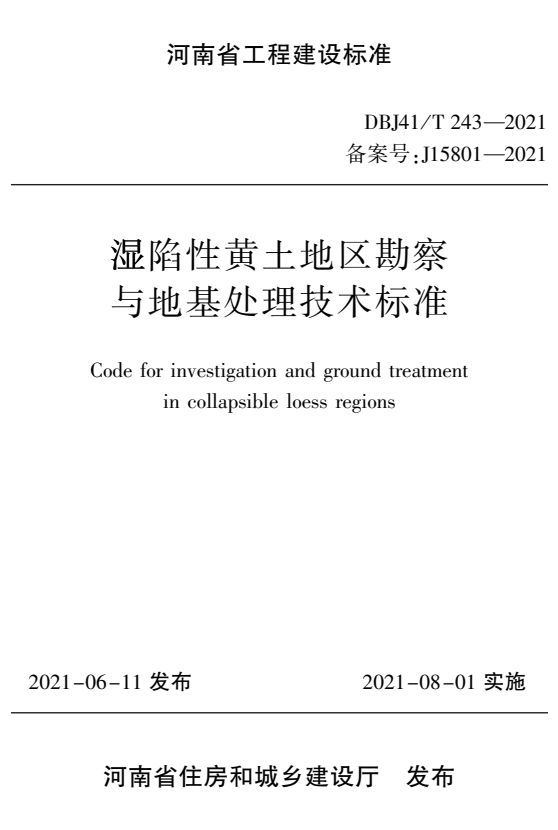 标准介绍:DBJ41/T 243-2021 湿陷性黄土地区勘察与地基处理技术标准HnH免费标准库