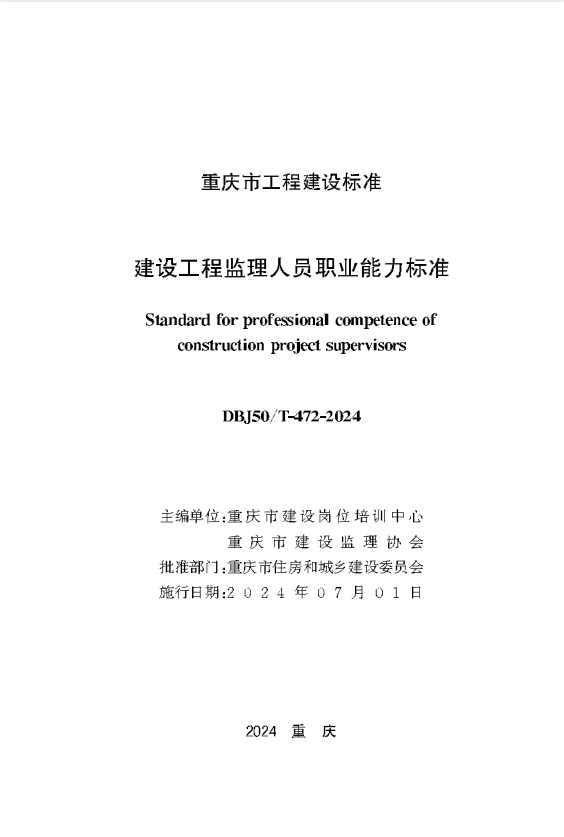 标准介绍:DBJ50/T 472-2024 建设工程监理人员职业能力标准
