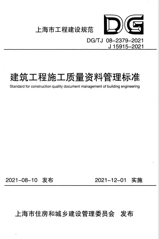 标准介绍:DG/TJ 08-2379-2021 建筑工程施工质量资料管理标准