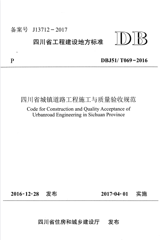 标准介绍:DBJ51/T 069-2016 四川省城镇道路工程施工和质量验收标准Oio免费标准库