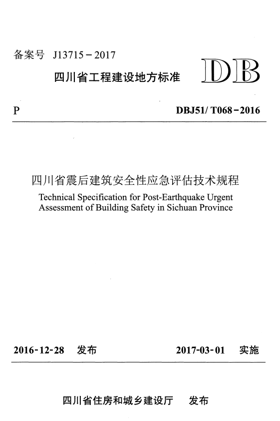 标准介绍:DBJ51T 068-2016 四川省震后建筑安全性应急评估技术规程QOF免费标准库