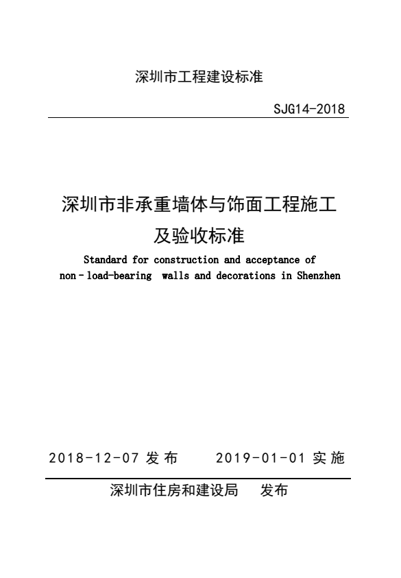 标准介绍:SJG 14-2018 深圳市非承重墙体与饰面工程施工能验收标准JZn免费标准库
