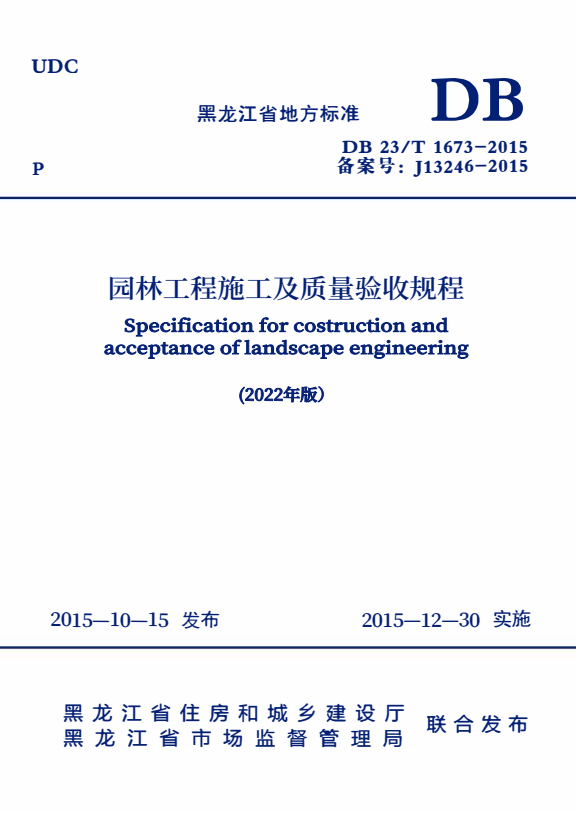 标准介绍:DB23/T 1673-2015 园林工程施工及质量验收规范(2022年版)