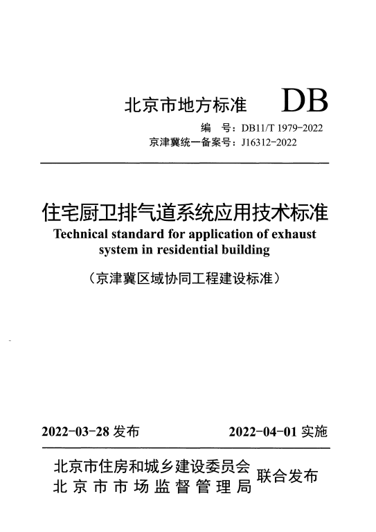 标准介绍:DB11/T 1979-2022 住宅厨卫排气道系统应用技术标准 附条文说明