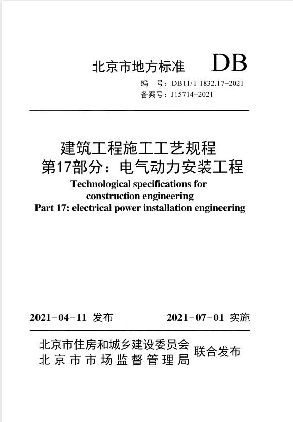 标准介绍:DB11/T 1832.17-2021 建筑工程施工工艺规程 第17部分:电气动力安装工程hOX免费标准库