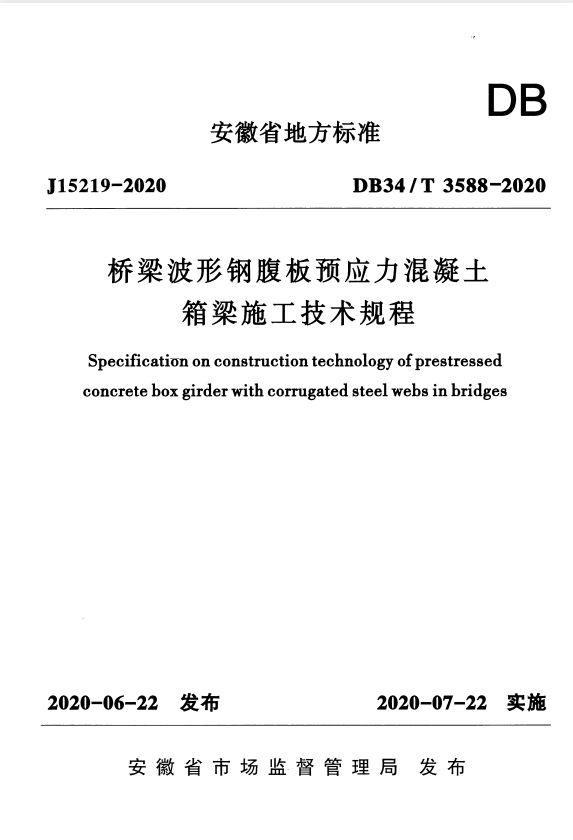 标准介绍:DB34/T 3588-2020 桥梁波形钢腹板预应力混凝土箱梁施工技术规程TV7免费标准库