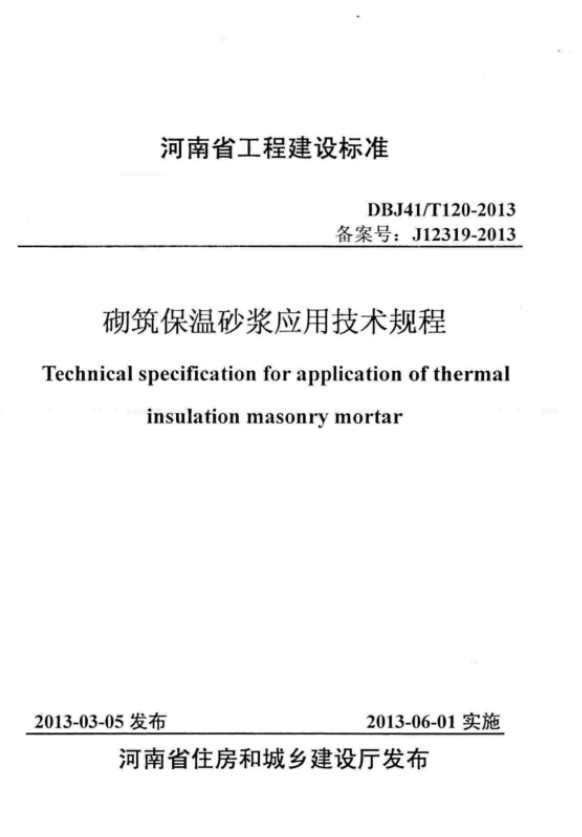 标准介绍:DBJ41/T 120-2013 砌筑保温砂浆应用技术规程VBf免费标准库