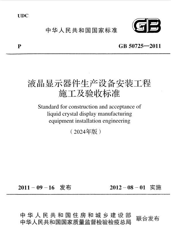 标准介绍:GB 50725-2011 液晶显示器件生产设备安装工程施工及验收标准(2024版)