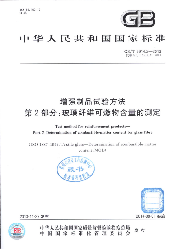 GB/T 9914的本部分规定了玻璃纤维制品可燃物含量的测定方法。