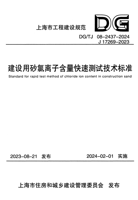 标准介绍:DG/TJ 08-2437-2024 建设用砂氯离子含量快速测试技术标准e5K免费标准库