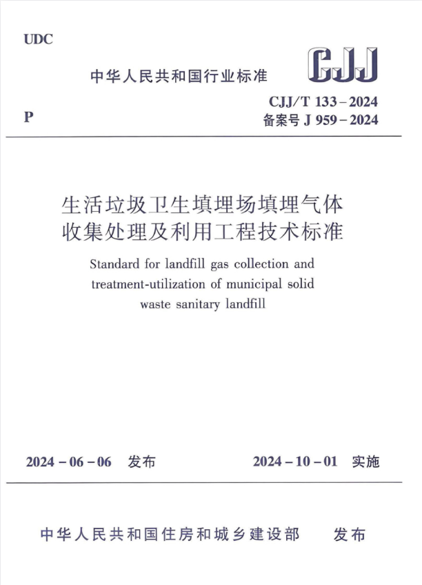 标准介绍:CJJ/T 133-2024 生活垃圾卫生填埋场填埋气体收集处理及利用工程技术标准