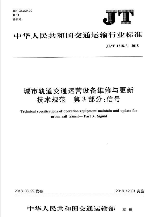 JT/T 1218.3-2018 城市轨道交通运营设备维修与更新技术规范 第3部分:信号A5p免费标准库本部分规定了城市轨道交通信号设备维修与更新的基本要求,以及维修和更新改造要求。 本部分适用于地铁和轻轨信号设备的维修与更新工作,其他城市轨道交通信号设备可参照使用。A5p免费标准库