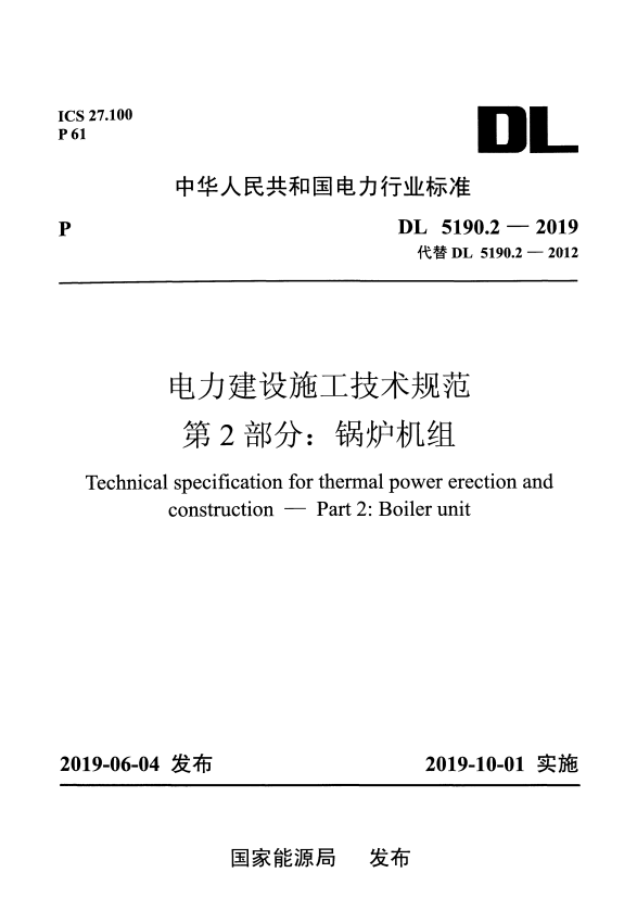 标准介绍:DL 5190.2-2019 电力建设施工技术规范 第2部分:锅炉机组