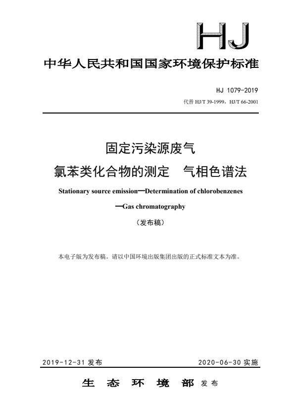 标准介绍:HJ 1079-2019 固定污染源废气 氯苯类化合物的测定 气相色谱法