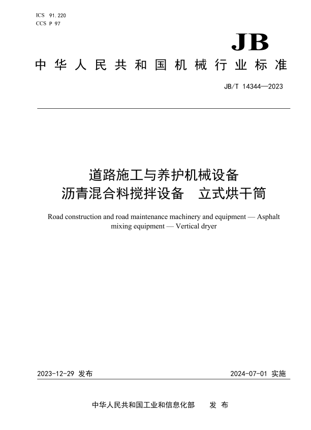 标准介绍:JB/T 14344-2023 道路施工与养护机械设备 沥青混合料搅拌设备 立式烘干筒