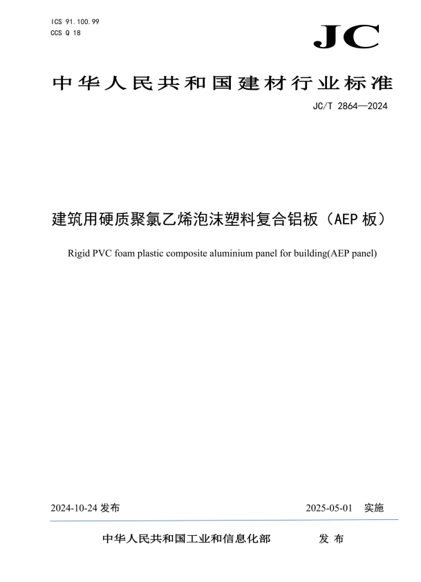 标准介绍:JC/T 2864-2024 建筑用硬质聚氯乙烯泡沫塑料复合铝板(AEP板)