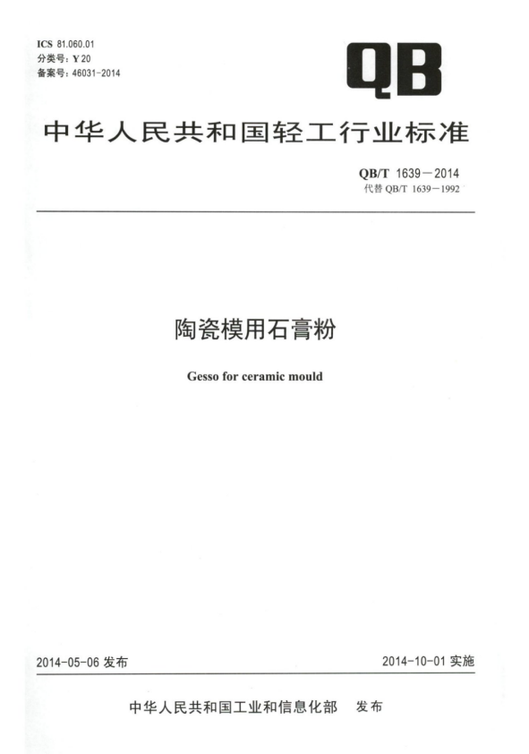 标准介绍:QB/T 1639-2014 陶瓷模用石膏粉