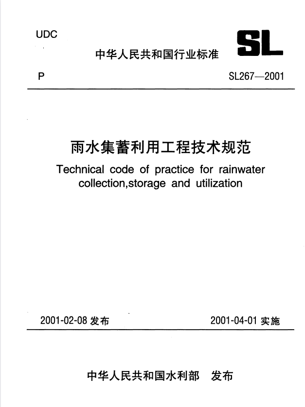 标准介绍:SL 267-2001 雨水集蓄利用工程技术规范 附条文说明