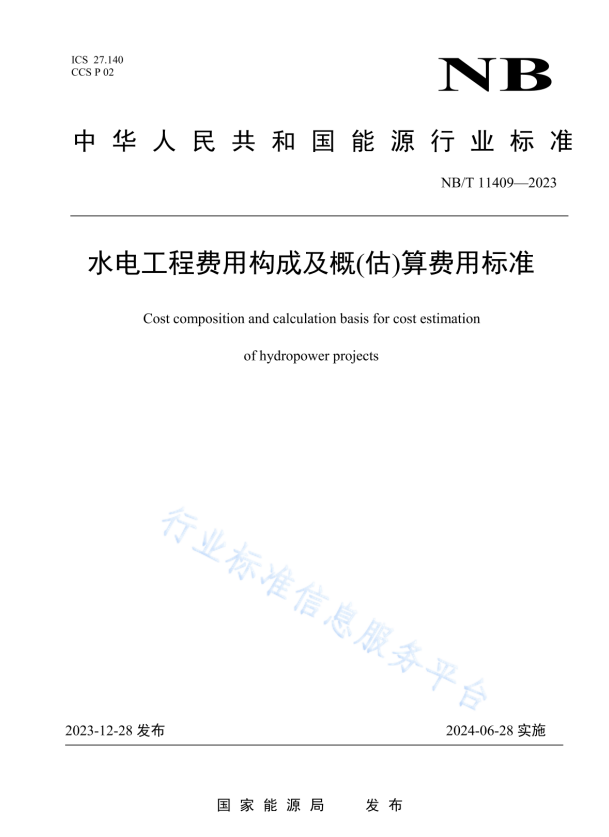 标准介绍:NB/T 11409-2023 水电工程费用构成及概(估)算费用标准