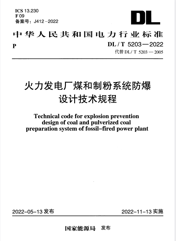 标准介绍:DL/T 5203-2022 火力发电厂煤和制粉系统防爆设计技术规程