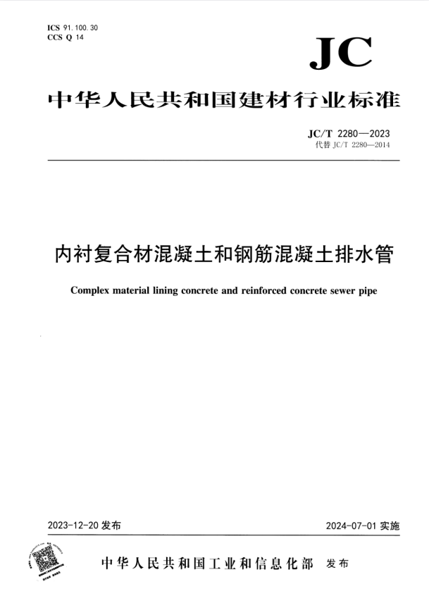 标准介绍:JC/T 2280-2023 内衬复合材混凝土和钢筋混凝土排水管