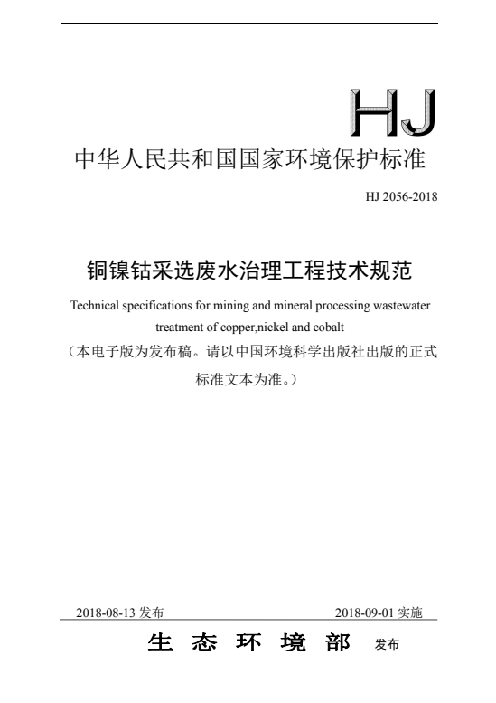 标准介绍:HJ 2056-2018 铜镍钴采选废水治理工程技术规范