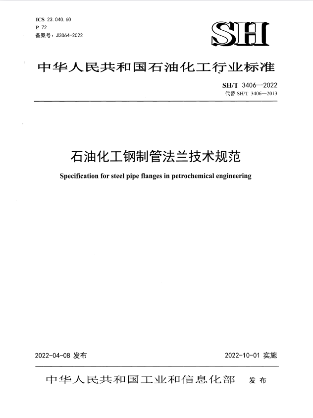 标准介绍:SH/T 3406-2022 石油化工钢制管法兰技术规范