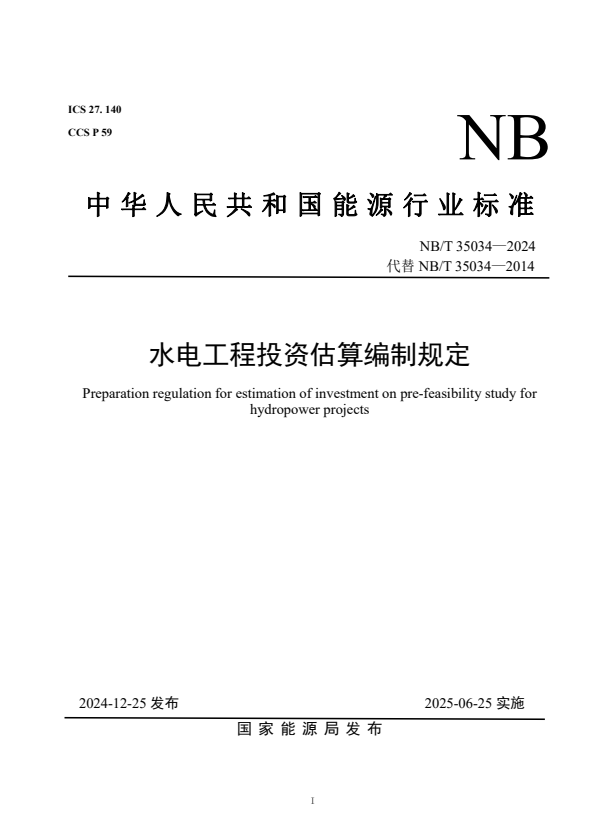 标准介绍:NB/T 35034-2024 水电工程投资估算编制规定
