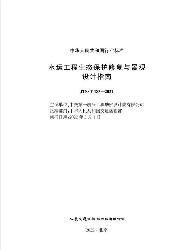 标准介绍:JTS/T 183-2021 水运工程生态保护修复与景观设计指南Ghg免费标准库