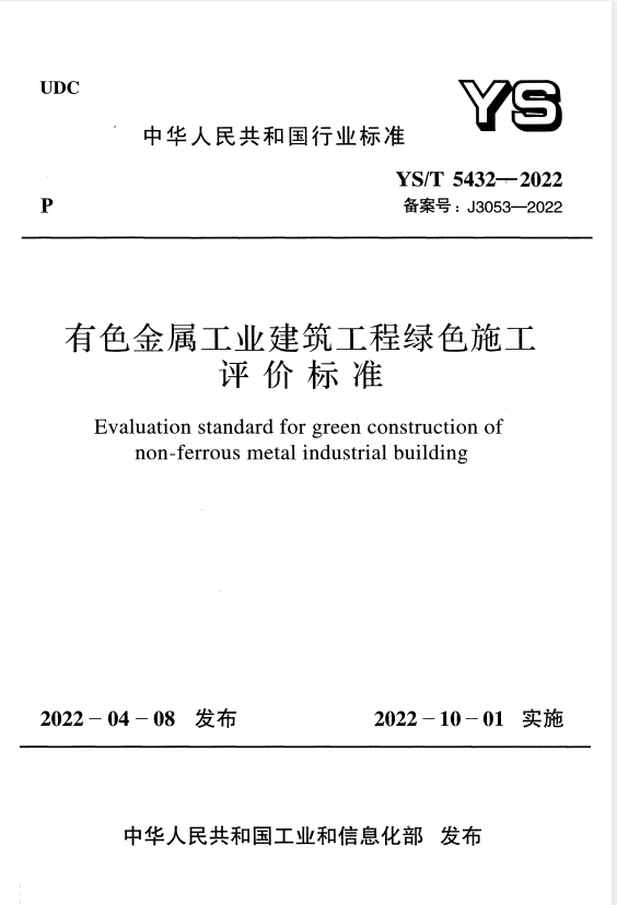 标准介绍:YS/T 5432-2022 有色金属工业建筑工程绿色施工评价标准