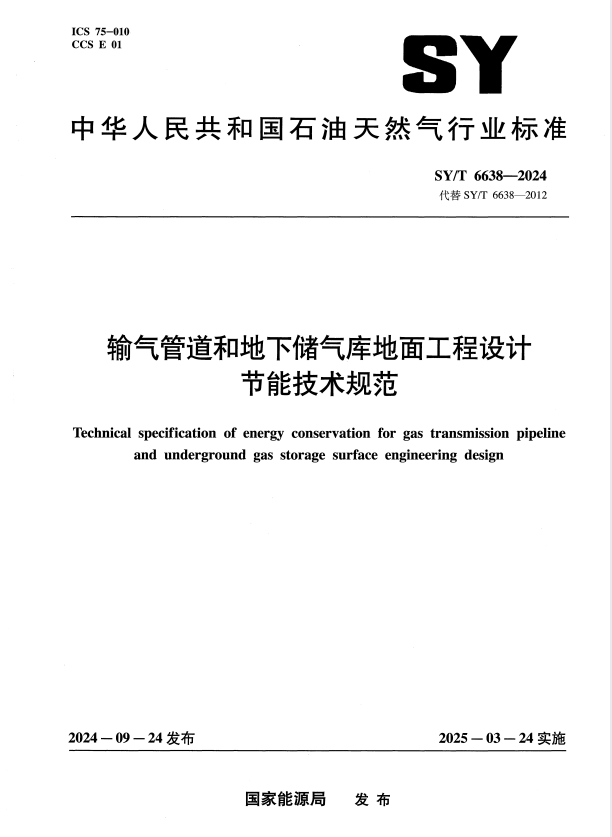 标准介绍:SY/T 6638-2024 输气管道和地下储气库地面工程设计节能技术规范