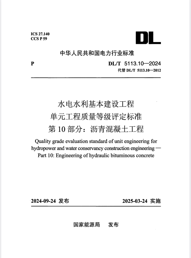 标准介绍:DL/T 5113.10-2024 水电水利基本建设工程 单元工程质量等级评定标准 第10部分:沥青混凝土工程
