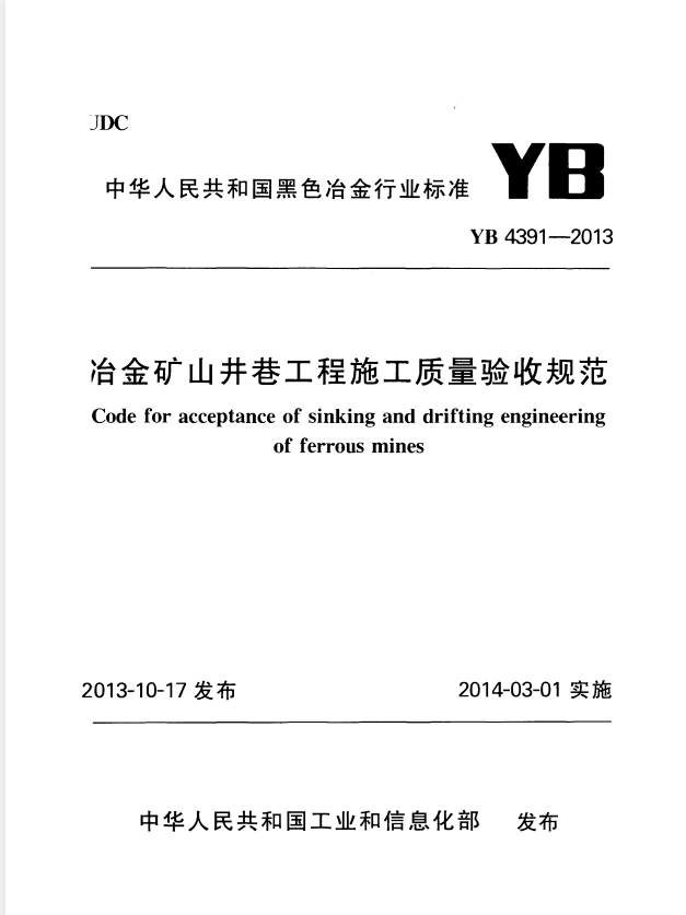 标准介绍:YB 4391-2013 冶金矿山井巷工程施工质量验收规范