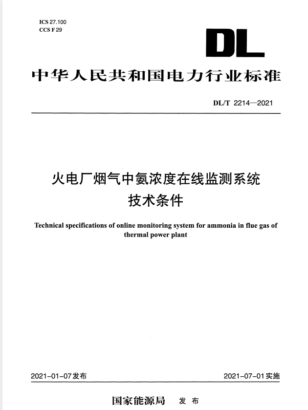 标准介绍:DL/T 2214-2021 火电厂烟气中氨浓度在线监测系统技术条件