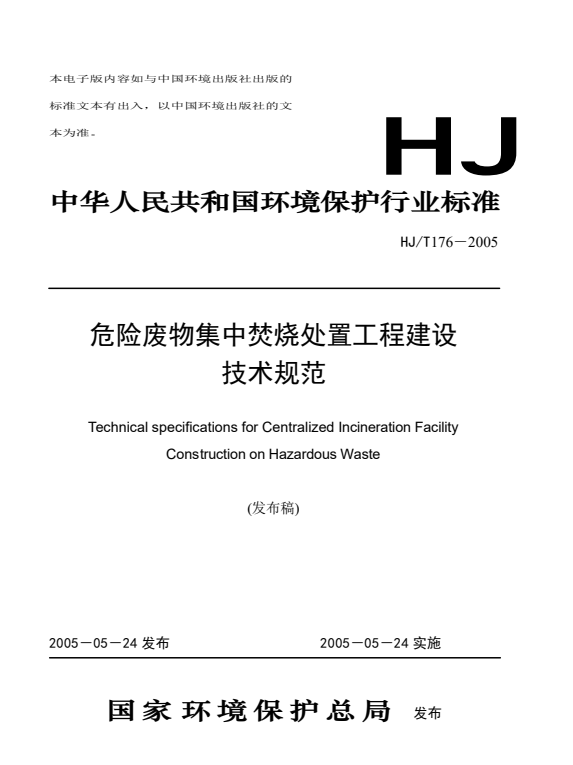标准介绍:HJ/T 176-2005 危险废物集中焚烧处置工程建设技术规范