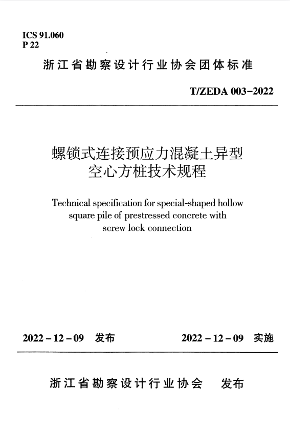 标准介绍:T/ZEDA 003-2022 螺锁式连接预应力混凝土异型空心方桩技术规程
