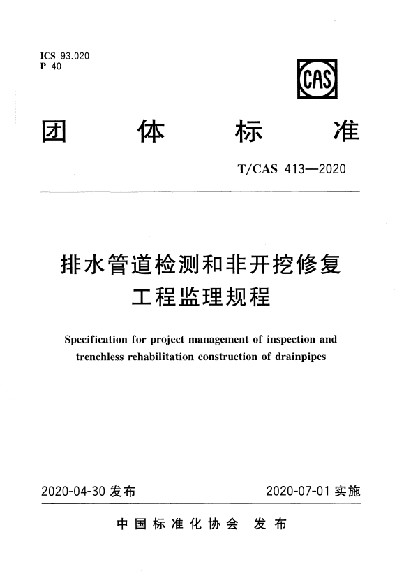 标准介绍:T/CAS 413-2020 排水管道检测和非开挖修复工程监理规程