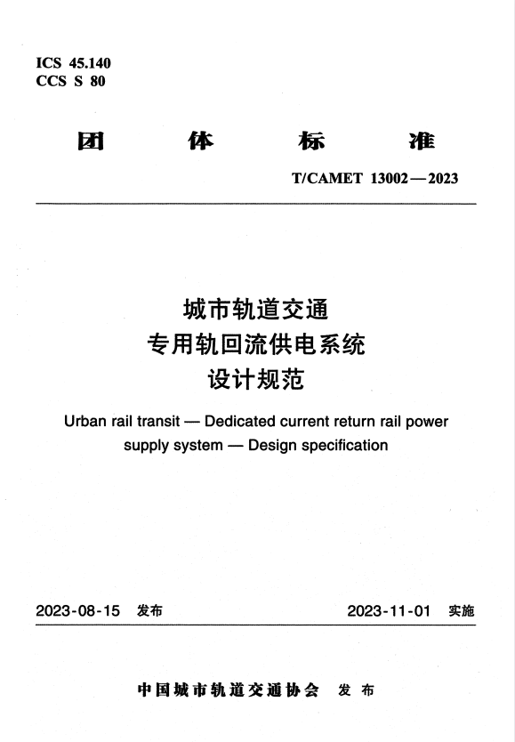 标准介绍:T/CAMET 13002-2023 城市轨道交通 专用轨回流供电系统 设计规范