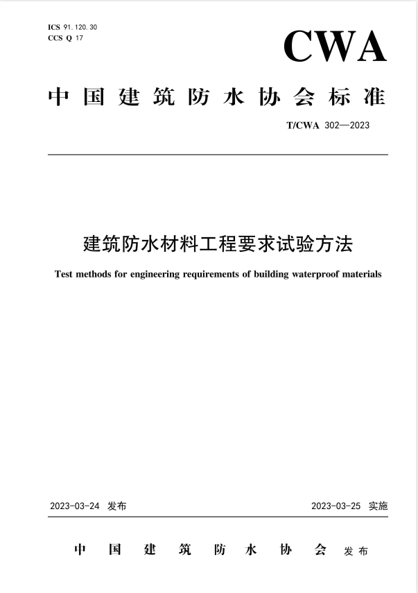 标准介绍:T/CWA 302-2023建筑防水材料工程要求试验方法