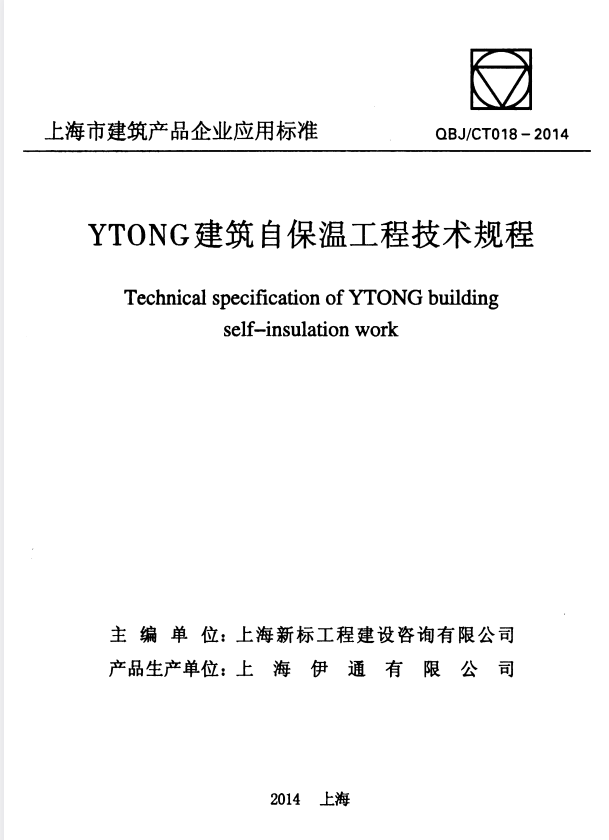 标准介绍:QBJ/CT 018-2014 YTONG建筑自保温工程技术规程