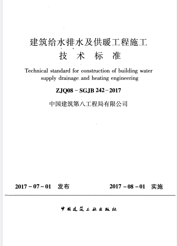 标准介绍:ZJQ 08-SGJB242-2017 建筑给水排水及供暖工程施工技术标准