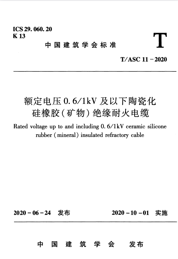 标准介绍:T/ASC 11-2020 额定电压0.6/1kV及以下陶瓷化硅橡胶(矿物)绝缘耐火电缆ItB免费标准库