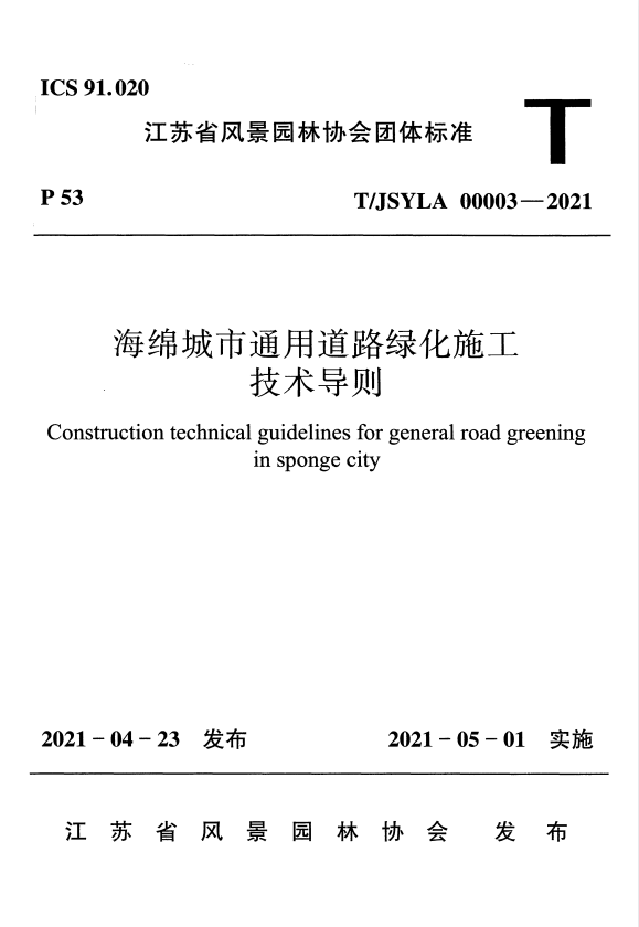 标准介绍:T/JSYLA 00003-2021 海绵城市通用道路绿化施工技术导则Fs1免费标准库