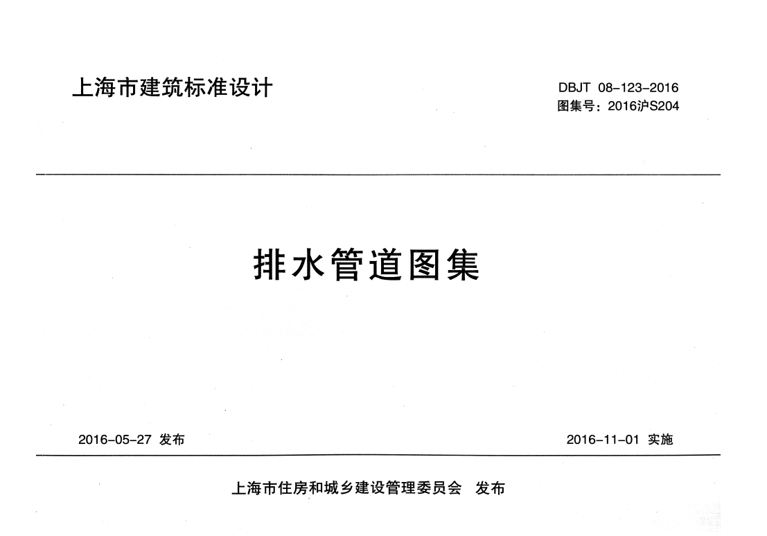 上海市建筑标准设计jam免费标准库DBJT08-123-2016jam免费标准库图集号:2016沪S204 排水管道图集jam免费标准库2016-05-27发布jam免费标准库2016-11-01实施jam免费标准库